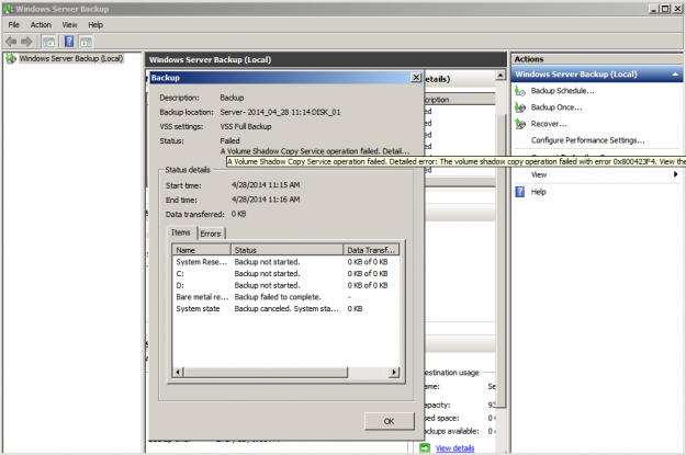 Windows Server 2008 R2 Backup falla a los pocos minutos de iniciar con el siguiente error. A Volume Shadow Copy Operation failed with error 0X800423F4.